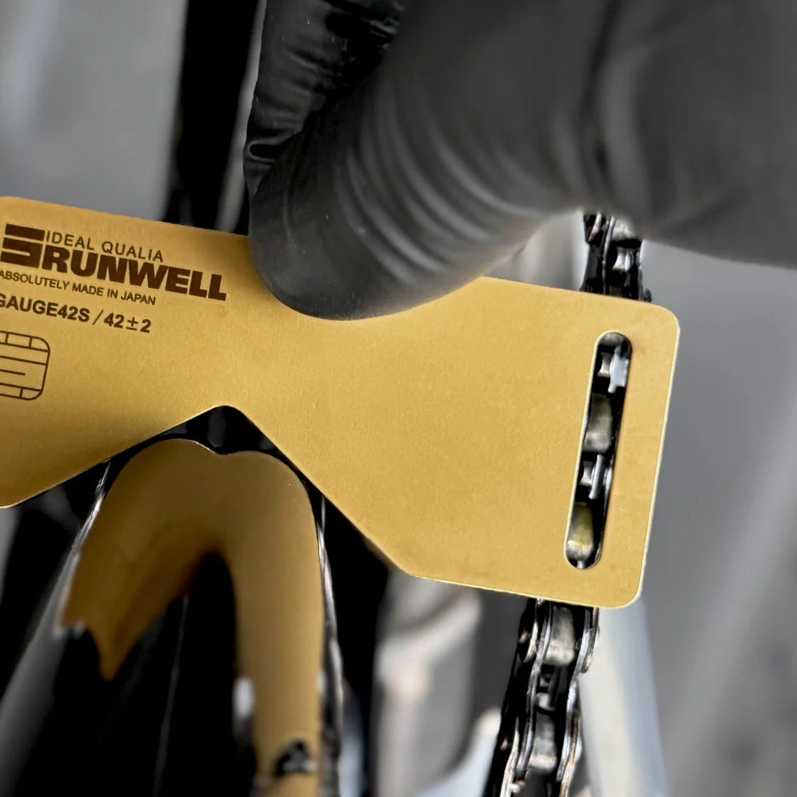 最高のパフォーマンスを発揮するためのチェーンラインを、黄金のカード型ゲージでワンタッチ確認。多忙な競輪場の検車時に活躍しているゲージです。